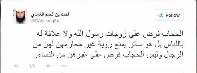 In another tweet, Ahmed bin Qassim al-Ghamidi goes as far as to claim that only the wives of prophet (MPBUH) "were required to wear Hijab so that adult males outside of their immediate family couldn't see them."