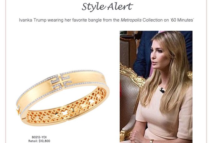 "Ivanka wearing her favorite bangle from the Metropolis Collection over the weekend on '60 Minutes,' " the blast crowed. "Please share this with your clients."