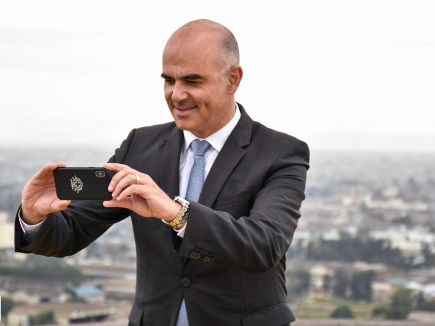 Swiss president Alain Berset takes a selfie on the 27th floor of the KICC in July 2018