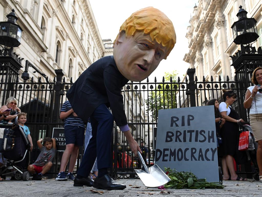 Grave concerns: Protester in Boris mask at gates of Downing Street PICTURE: GETTYLast night, Mr Johnson was urged to scrap the suspension or put it to a Commons vote, in a joint statement from Labour, the SNP, the Lib Dems, Plaid Cymru, the Green Party and The Independent Group for Change.