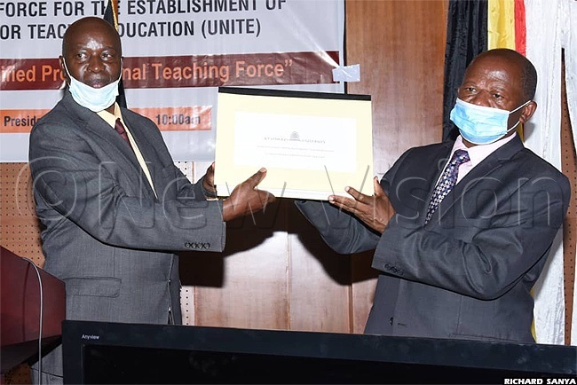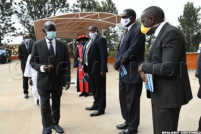 In the picture below taken by New Vision's Richard Sanya, the State minister for higher education, John Chrysestom Muyingo (right), received the results Kyambogo University vice-chancellor Eli Katunguka at the Office of the Prime Minister.